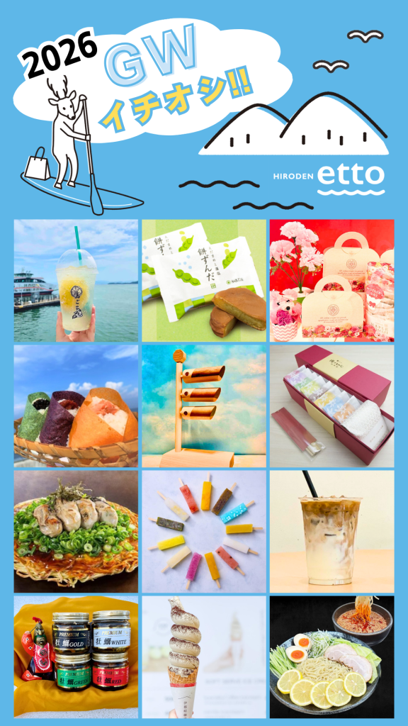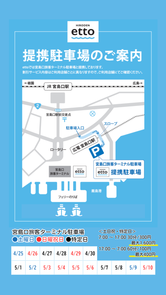 ホームページをご覧の皆様に、各店舗より届いたGWのイチオシ商品と宮島口旅客ターミナル駐車場についてご案内いたします!